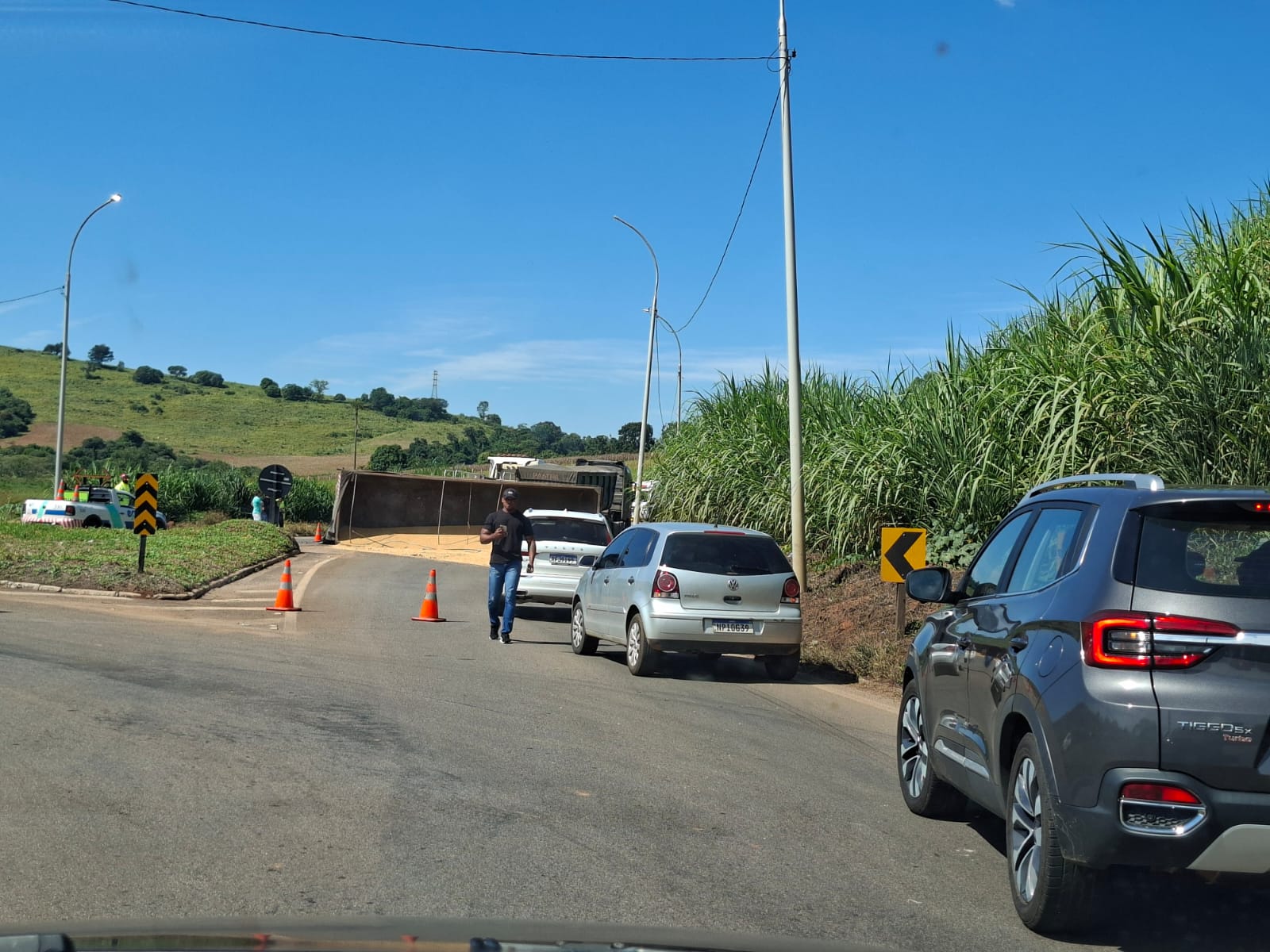 Acidente ocorreu no trevo de acesso ao bairro Pinheirinho; carga ficou espalhada na pista e rodovia foi interditada