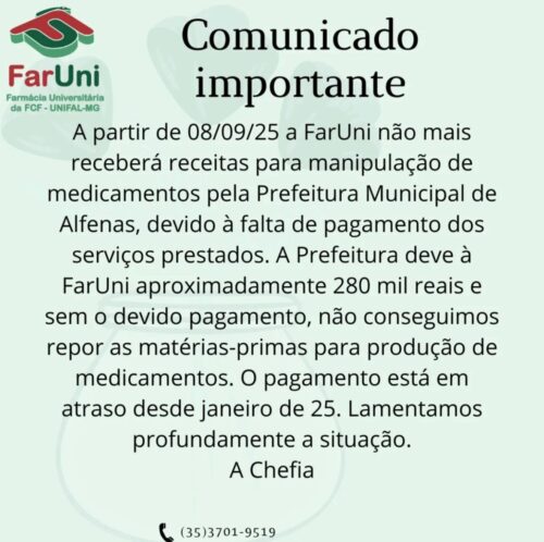 Em um comunicado oficial, a Farmácia Universitária da Faculdade de Ciências Farmacêuticas (FCF) da Universidade Federal de Alfenas (Unifal MG) anunciou a suspensão da aceitação