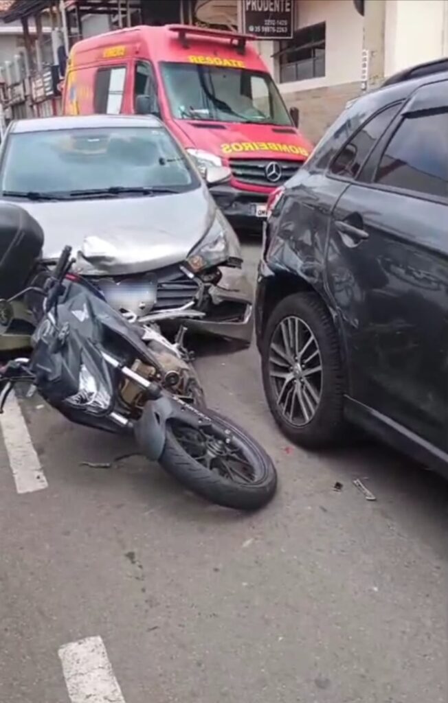 Na tarde desta quarta-feira (05/11), o Corpo de Bombeiros de Alfenas foi acionado para atender um acidente de trânsito no centro da cidade, envolvendo três veículos: um Hyundai/HB20, um Mitsubishi/ASX GLS, e uma motocicleta Honda/CB 300F Twister, conduzida por uma mulher grávida.