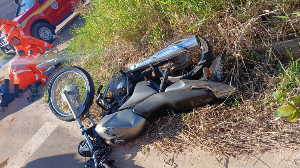 De acordo com os militares, o motociclista, um homem, sofreu escoriações e apresentava suspeita de fratura no fêmur após o impacto.