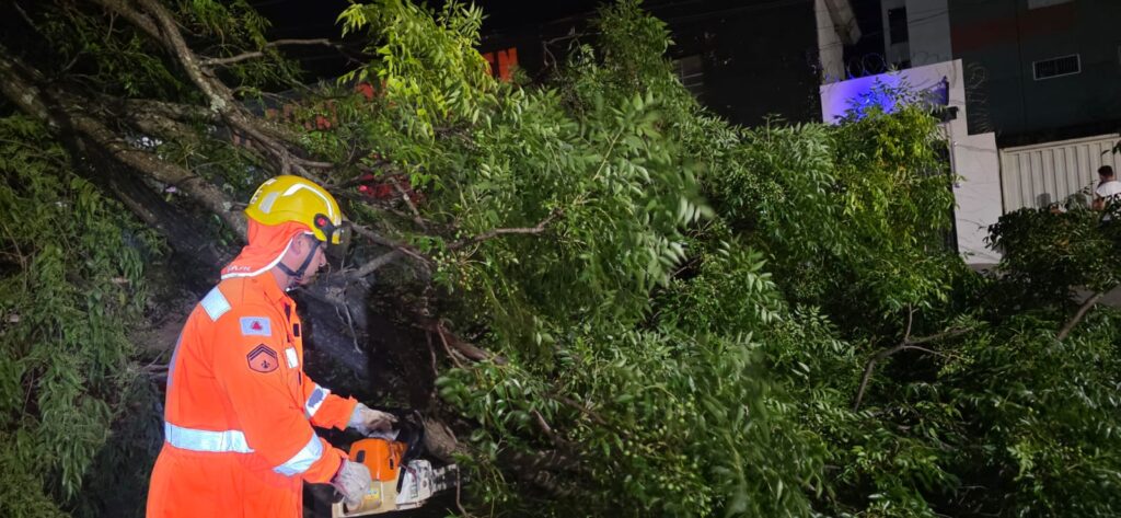 Ao chegarem ao local, os bombeiros procederam com o isolamento da área afetada, utilizando cones e sinalização apropriada para garantir a segurança de todos. Com a ajuda de motosserras, a equipe realizou o corte e a remoção dos troncos e galhos, operando com eficácia e segurança.