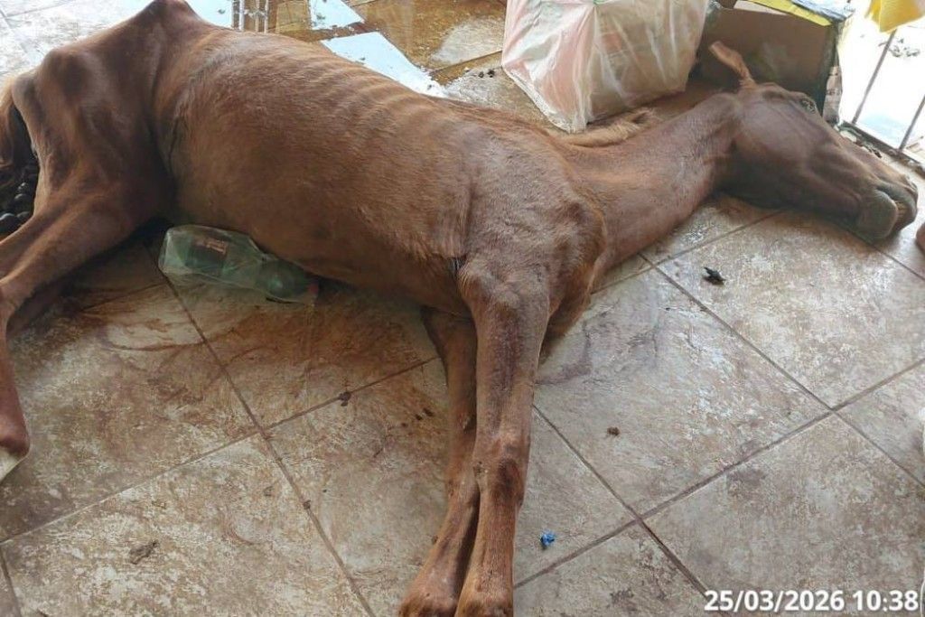 No local, os policiais encontraram uma égua já morta, em estado de extrema magreza e com ferimentos expostos.