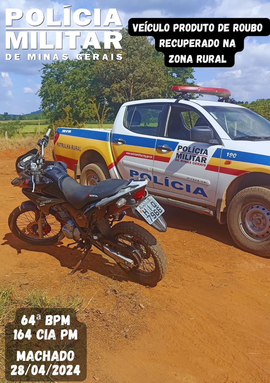 A Polícia Militar (PMMG) de Machado, no Sul de Minas, recuperou uma moto roubada no último domingo (28/04) graças à rápida atuação da equipe de Moto Patrulha.