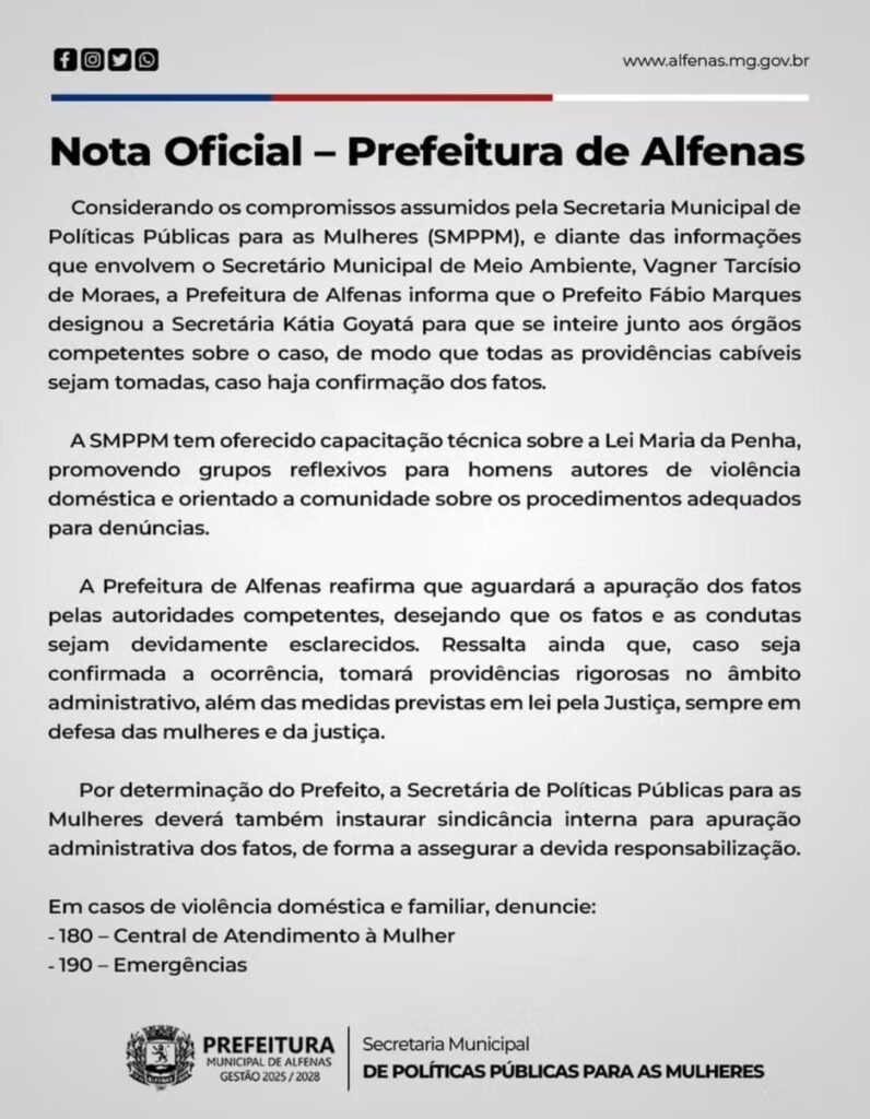 Veja a nota da Prefeitura Municipal de Alfenas sobre o caso do atual Secretario do Meio Ambiente: