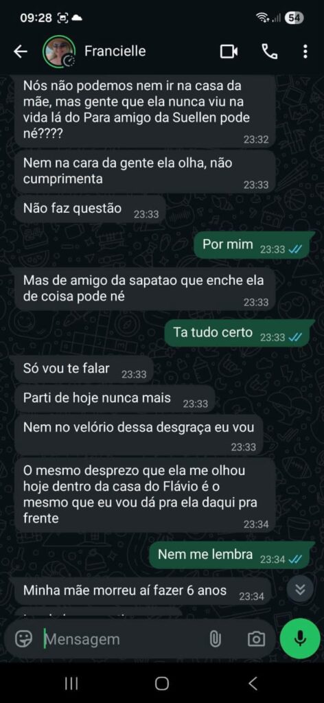 Ela apresentou um print de uma conversa de Franciele com o irmão, na qual o chama de “sapatão” e, ainda, faz ataques à própria mãe, chamando-a de “desgraça” e afirmando que ela teria morrido há seis anos, apesar de estar viva, sendo uma idosa de 68 anos.